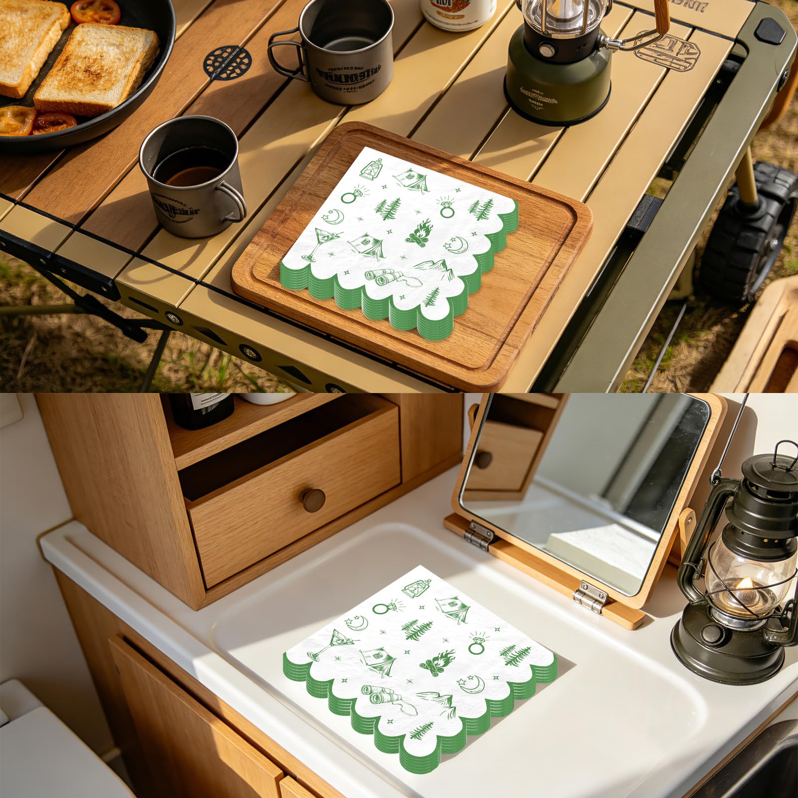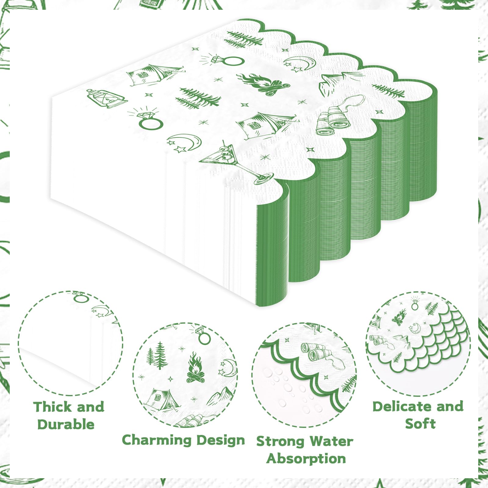 Elevate your camp bachelorette party with Grencian's large capacity set of 100 pcs 2-ply green camp bachelorette square party napkins. Perfect for daily dinners, party decorations, or themed events, these napkins feature a vibrant green camp bachelorette design with tents, campfires, mountains, and diamond rings. Folded at 16.5 x 16.5cm (6.5 x 6.5in) and unfolding to 33 x 33cm (13 x 13in), they offer ample absorbency without bulky storage—ideal for creating a cohesive outdoor adventure vibe.