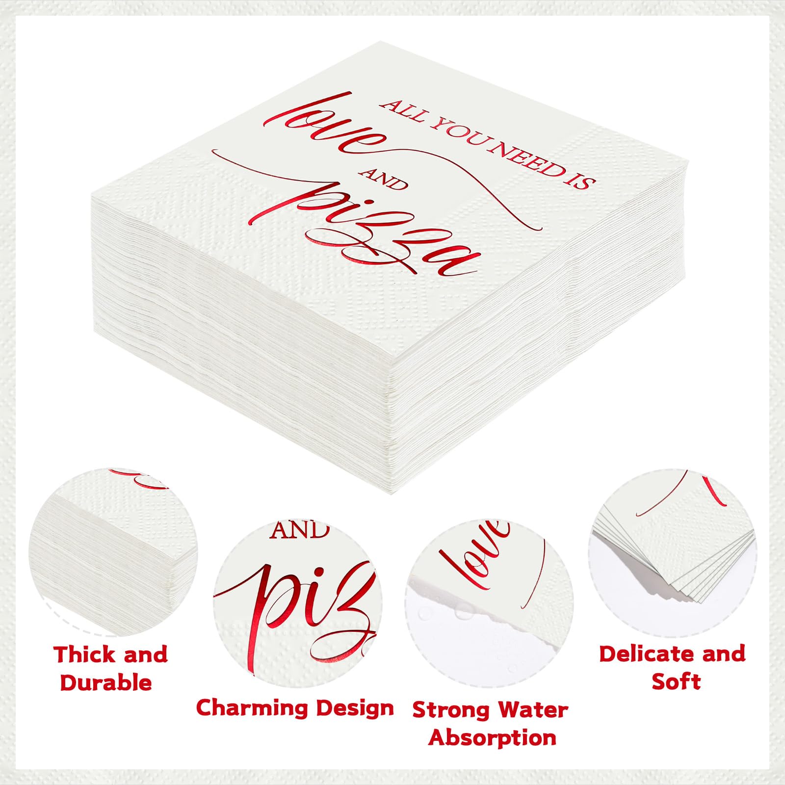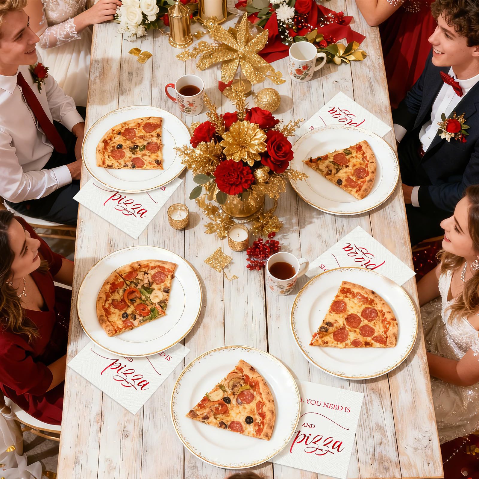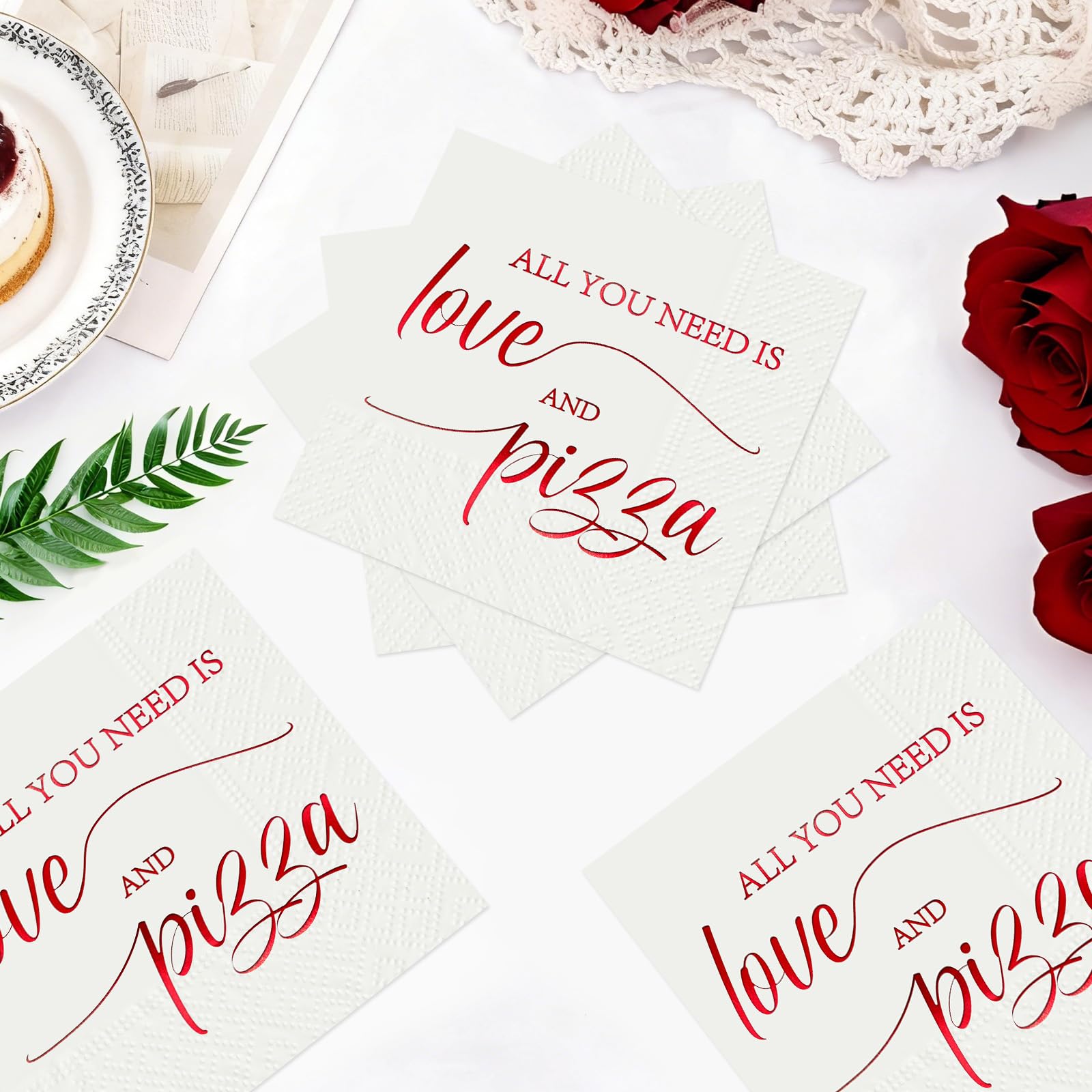 Elevate your pizza wedding or themed party with Grencian's 100 Pcs Pizza Wedding Square Party Napkins. These 3-ply pizza wedding napkins feature a fun "ALL YOU NEED IS LOVE AND PIZZA" slogan in red cursive on a white base, accented by gold-foil details for a chic touch. Folded at 6.5x6.5 inches and unfolding to 13x13 inches, they're perfect for daily dining, bathroom use, or party decoration—sufficient quantity for any event without bulky storage.