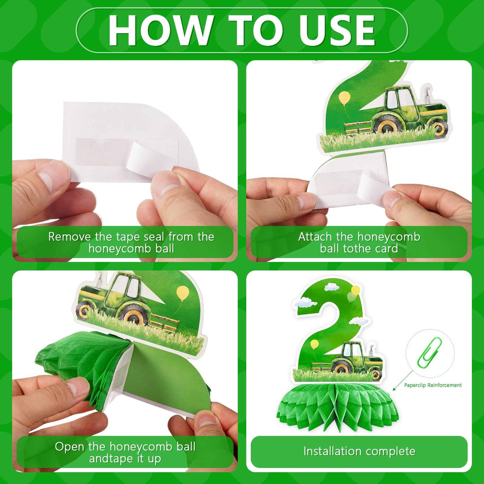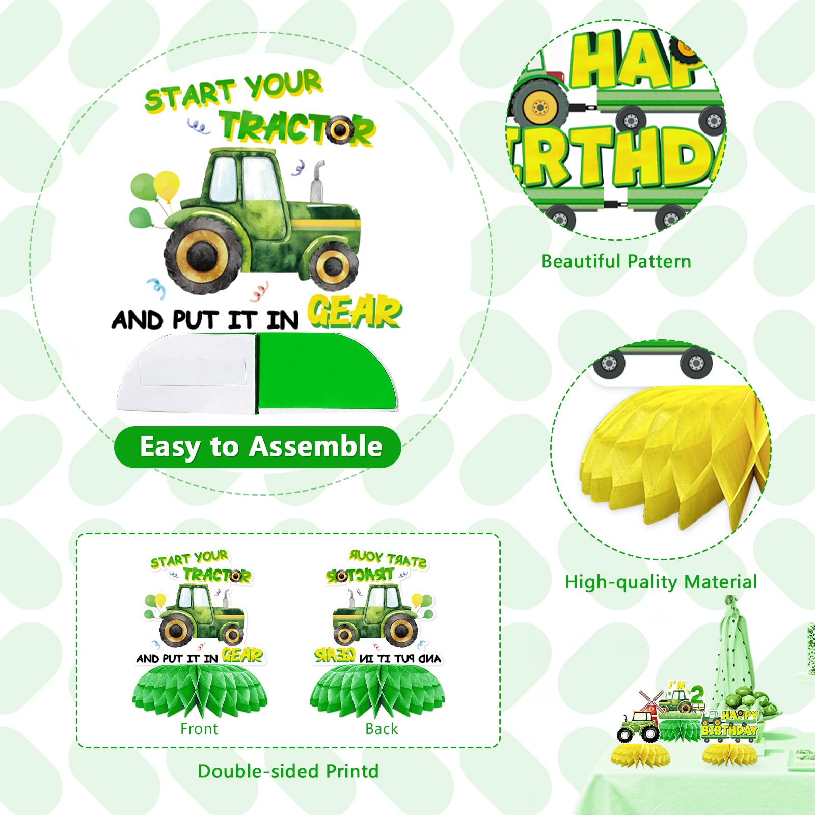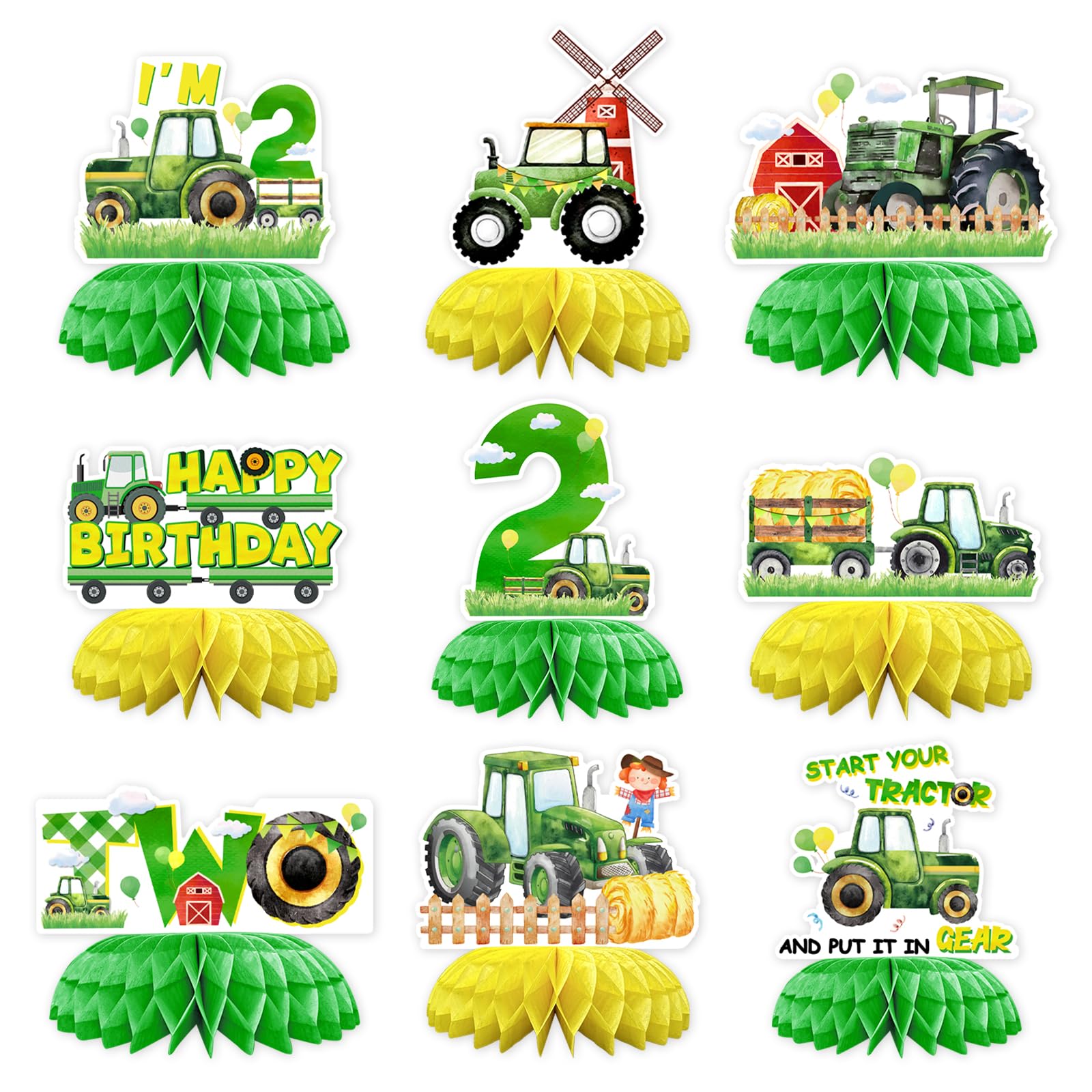 Elevate your boy's 2nd birthday with these 9 Pcs Tractor 2nd Birthday Honeycomb Centerpieces, featuring vibrant green and yellow tractors, windmills, barns, and hay bales. Perfect for tractor-themed parties, they pop up into stunning 3D displays, adding rustic farm fun to tables. Package includes 9 pieces in varied patterns—trusted by over 10,000 parents for memorable kids' birthdays.