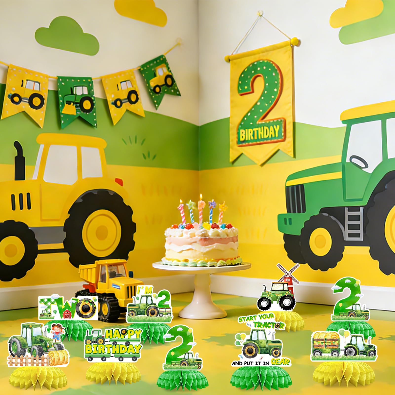 Backed by John Deere-inspired colors (80% of boys aged 2-5 love tractors, per toy industry stats), these honeycomb pieces create a fun and rustic touch that's Instagram-worthy. They make your boys tractors themed 2nd birthday party unforgettable, drawing eyes to every table.
